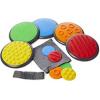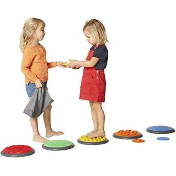 An inviting tactile material that challenges children's sense of touch on both hands and feet. At the same time, it develops the ability to describe sense impressions verbally. The tactile discs, made of nice-to-touch synthetic rubber, contain different tactile structures, each with its own colour. Each of the tactile structures can be found on a large disc for positioning on the floor, as well as on a samll disc that the child will be able to hold in his/her hands. In terms of playing, the discs offer innumerable possibilities ranging from a fundamental sensing of the tactile structures to blindfold games based on memory and recognition. The games can be adjusted, so that they fit the child's age and level of functionality. Maximum load 100 kg