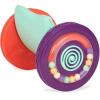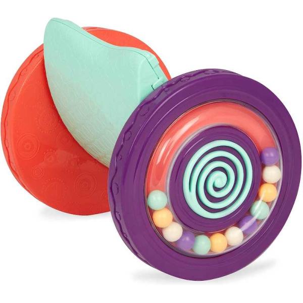 Just roll with it! The 2 sturdy and funky wheels offer great stability One wheel rattles with beads, while the other one wows with a spiral design and a soft chime