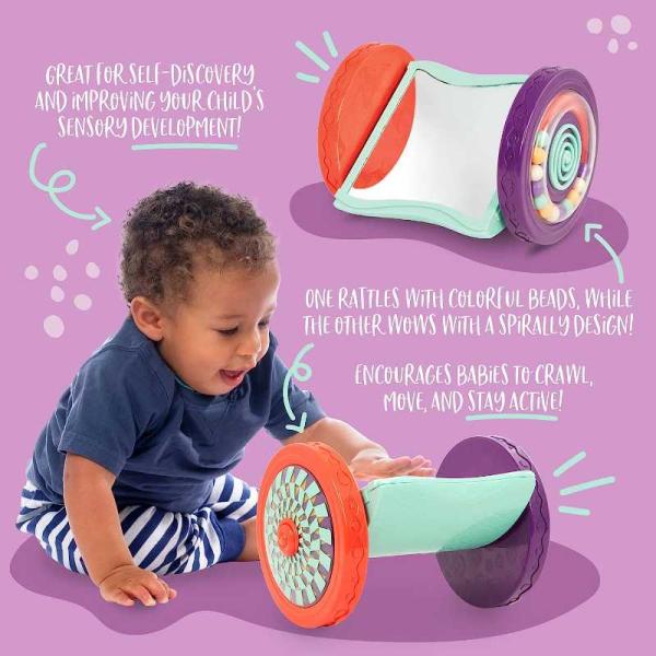 Looky looky, this rolling mirror’s funky! Bursting with colors and rolling with fun features, this baby mirror toy rolls across the floor and always stays upright